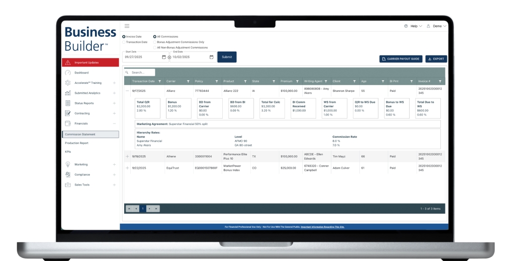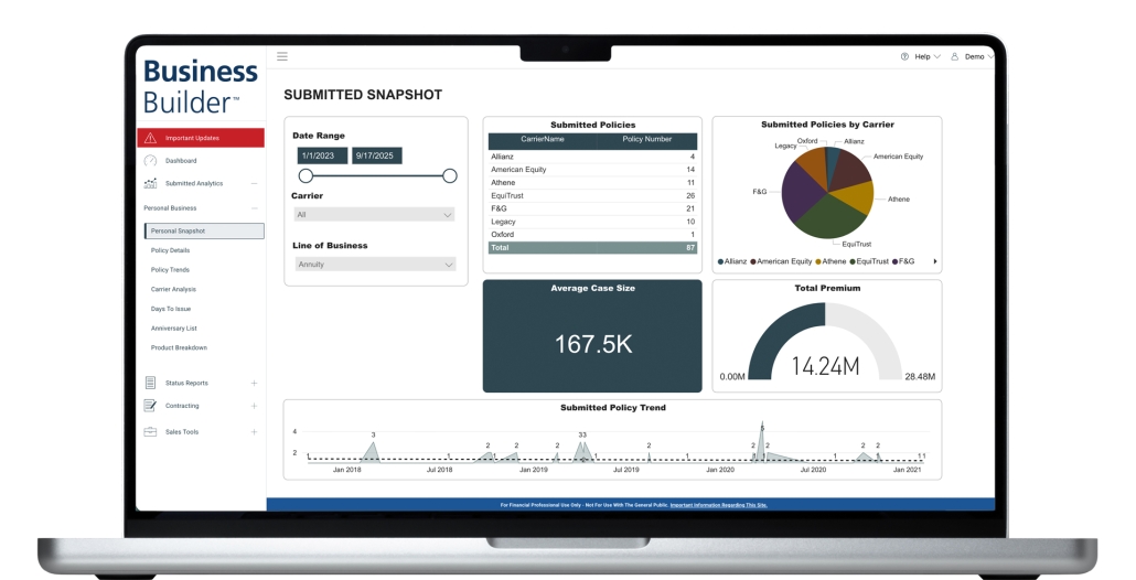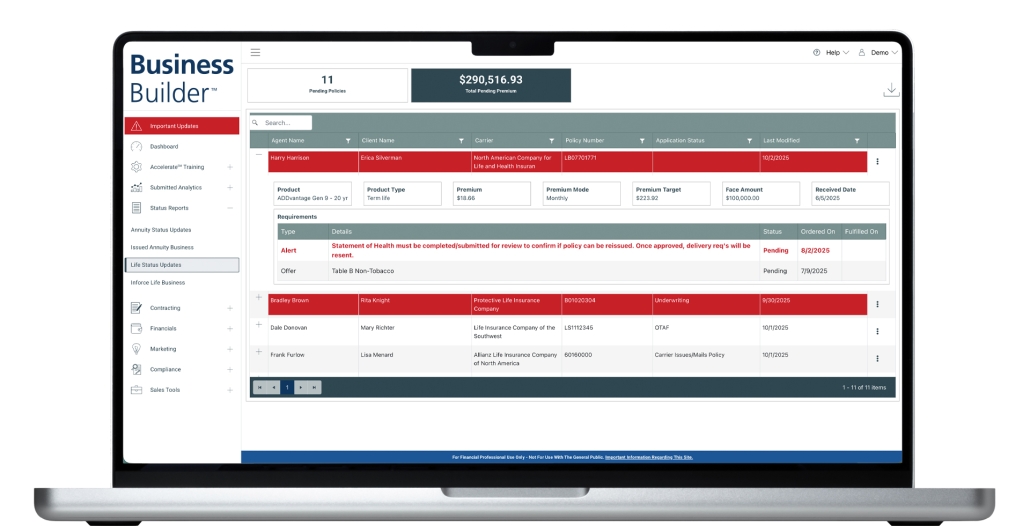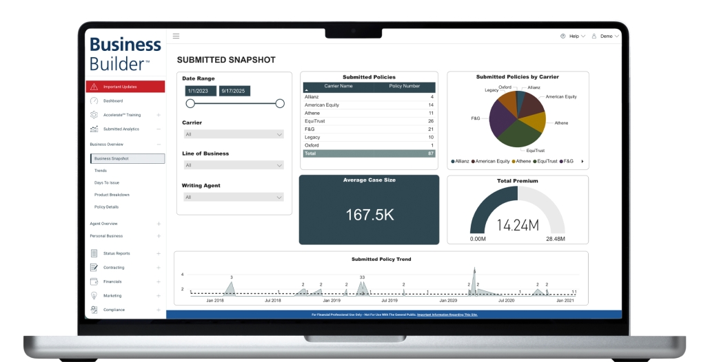 With the power of Business Builder, managing your agency and your downline has never been easier. Business Builder uses the power of real-time analytics to put valuable insights into your agency at your fingertips so you can make smarter, data-driven decisions. Plus, you’ll work with a dedicated case manager to assist you, your agents, and your internal staff.